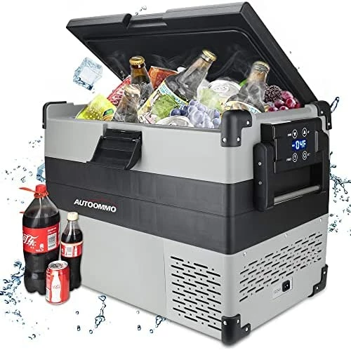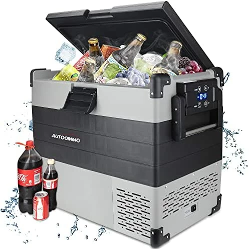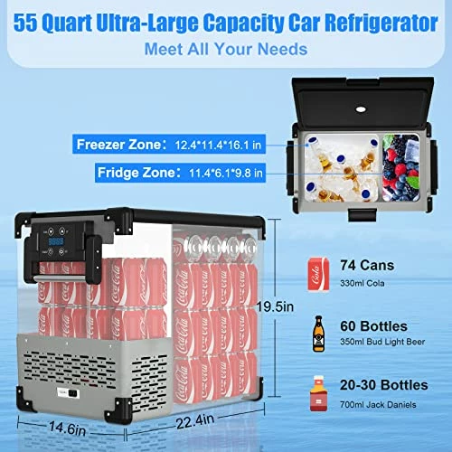 - 【SUPER LARGE CAPACITY】: This affordable but durable 55 Quart car refrigerator offers enough space for 74 cans 330ml Cola or 60 battles 350ml beer 22.4(L)x14.6(W)x19.5(H) inch, which means that’s plenty of space for lunch, drinks, snacks, and quick-frozen food for your entire family on your trip and camping. It’s also tall enough to store some large bottles of juice or wine.