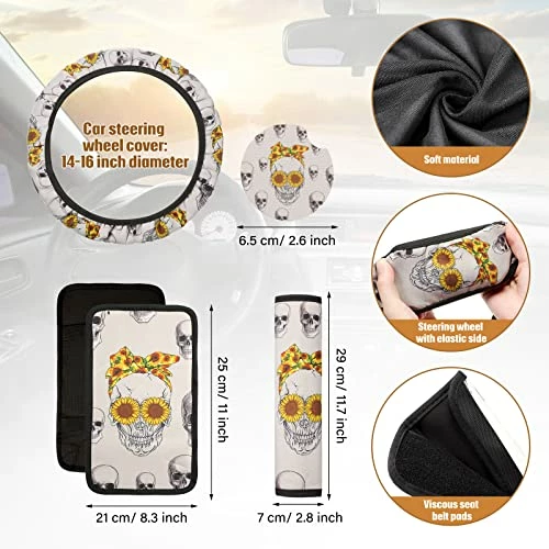 - Charming Design: these car accessories set is printed with skull and sunflower patterns, full of personality and mystery, making your car more attractive, bringing a natural and exotic flavor to you, giving you and your passengers visual enjoyment, as well as bringing a relaxed and different experience to you when driving; Decorate your car interior with this set of accessories to show your personal style