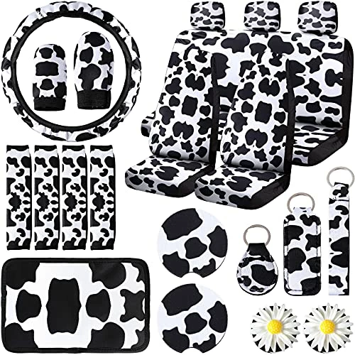 - Full set cow car accessories: you will get 22 pieces cow car accessories, including 2 pieces front seat covers, 1 piece rear bench seat cover, 1 piece car backrest cover, 3 pieces car headrest covers, 1 piece steering wheel cover, 2 pieces car pads, 1 piece lanyard, 2 pieces cow key rings, 1 piece armrest pad cover, 1 piece gear lever cover, 1 piece handbrake cover, 4 pieces seat belt cover, 2 pieces vent decors; There are hooks in the package to fix the car seat cover