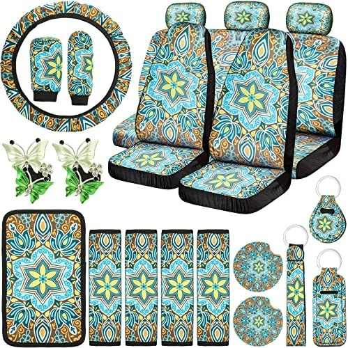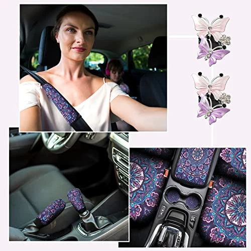 - What you receive: you will get 22 pieces of purple mandala car accessories set, including 4 seat belt covers, 2 front seat covers, 1 steering wheel cover, 1 armrest pad cover, 2 car pads, 2 car keychains, 2 vent decors, 1 rear bench seat cover, 1 car backrest cover, 3 car headrest covers, 1 wrist holder, 1 gear shift cover and 1 handbrake cover, a complete set for you to decorate and protect your car, you can also send them as gifts to your family or friends