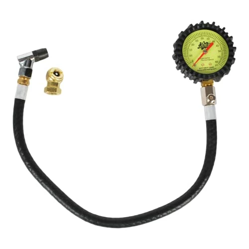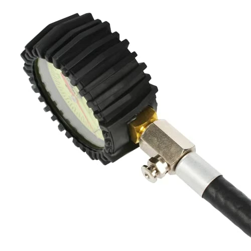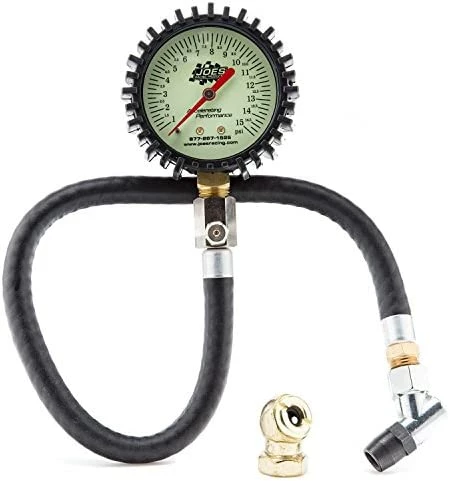 To say I’m pretty picky about my tools is an understatement, so I don’t give this tire pressure gauge 5 stars lightly.Recently, the little digital tire pressure gauge, that I had been using around the garage, bit the dust. So, I started searching on-line for a replacement, but didn’t have much luck. Originally, I was hoping to find a digital pressure gauge that was accurate to .1 PSI, but I quickly realized I would have to spend north of $100.Additionally, I needed a tire pressure gauge that would work not only for cars, but also for my motorcycle (which has very limited room around the valve stem due to the large front brake rotors). Trying to maintain a good seal on the valve stem of the bike – especially while pushing a lot of buttons – is a real hassle.So, after not having much luck locating a reasonably priced digital gauge (which would also work on the motorcycle), I ended up searching for mechanical gauges. The Joe’s Racing gauge had very good ratings on amazon and so I figured I’d take a chance on it – I’m glad I did.Here are the highlights:1. The construction of the gauge is very nice. It has a nice rubber sleeve around the gauge, which gives it a nice look and feel, as well as very good protection when you set it down on the garage floor, etc. The gauge is large and the distance between the divisions is large enough so that you can estimate down to 1/4 of a PSI without much difficulty.2. The hose is nice, although it’s not quite the quality of like commercial air compressor hose or anything. It’s more like large automotive fuel hose. On the gauge end, the hose is tightly attached, but you can still twist the gauge a little bit (which is nice, especially if you need to turn the gauge relative to the natural twist in the hose).3. On the fitting end of the hose (where the air chuck is), the fitting spins, which is handy. The gauge comes with two fittings. The brass threads at the end of the hose are very good quality. The smaller air chuck is cast, but it’s still nice quality also. Note: removing the fitting that comes attached to the hose (to switch to the other chuck) is a little difficult, since the threads are sealed with a liquid type compound that has dried.4. In my case, I removed the factory fittings that came with the gauge and installed my own double head wand type air chuck – this extends the reach slightly and also gives you much better control on the valve stems of cars, as well as easy reach for checking motorcycle tire pressures. I used teflon tape to seal the threads and had no problem.5. Using the gauge is really nice. You simply inflate the tire a bit beyond where you want, then hold the gauge on the valve stem; the gauge has a button up near the dial, which allows you to quickly bleed air off (while still holding the air chuck on the valve stem). 3 or 4 quick presses will drop the PSI by a pound or more. As mentioned (due to the distance between the marks on the gauge), it’s easy to set the pressure dead on or to the nearest .25 PSI or so. When you remove the gauge from the valve stem, it goes back to zero.6. Construction is very good from start to finish. Even if I had paid twice the $23.99 price, I still think I would have been pretty happy with the results.7. I recently tested this gauge against a digital tire pressure gauge that my friend had and the gauge was right on the money as far as its pressure readings. As mentioned in the instructions that come with the gauge, the gauge is very accurate and should not be dropped, nor run over the 60 PSI max.This is a very good quality gauge and it functions really well and is very easy to use. Taking tire pressure readings is very quick and easy now. The bleed off valve is really nice also and allows you to quickly reduce down the pressure to the desired setting.This is a top quality little gauge for the money. After receiving this gauge, I seriously doubt that I’ll ever go back to using a digital gauge again. Definitely recommended to anyone looking for a very nice quality tire pressure gauge.