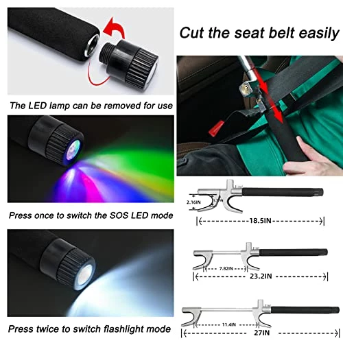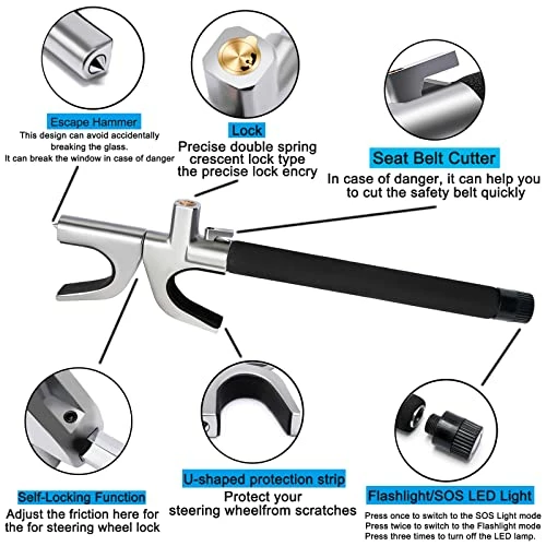 - ????【Emergency-Escape Tool】Under the keyhole of the Steering Wheel Lock, there is a Seat Belt Cutter.Sharp blade for easily cutting through a seat belt,Escape hammer is at the top of steering lock.It can break the window in case of danger.Trusted by first responders, Law Enforcement and EMTs and carried by more than 8 million motorists worldwide. seat belt cutter and window breaker saves a life on average every 15 days.