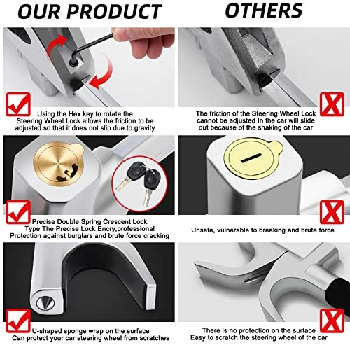 - ????【High quality & Anti-theft device】steering lock With aircraft-grade aluminum alloy material to Resists Prying, Sawing, Hammering, and Freon Attacks. The Precise Double Spring Crescent Lock Sub-Type Encoding Key Equipped with 2 unique atomic code keys, which are not easy to copy, others’ keys cannot open your Steering Lock, and the mutual opening rate is almost zero, protect the safety of your beloved car all the time!