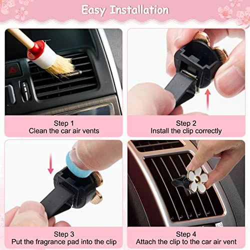 - ????【Easy to Use】First clean the air outlet, then insert the air conditioning outlet clip into the daisy, then put the fragrance pad on the back of the air vent clip, and finally insert the clip into the air outlet of the car. You can insert it horizontally or vertically according to the air outlet.