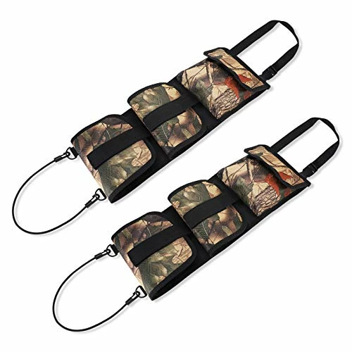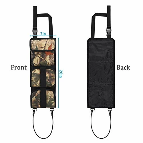 - Easy to Install: No tools require, just hang across the headrest of your vehicle. And it can hold up to 2 rifles at most. And there is a storage bag on the top for easy storage of items.