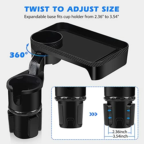 - 【EASY TO INSTALL】Rotate the adjustment dial to expand or retract the base. Put the adapter into the car cup holder and place the tray on it. Then put the included coaster and tray pad in position. 360° rotatable tray is convenient for both drivers and passengers to use. The car cup holder tray can be removed if you don’t need it.