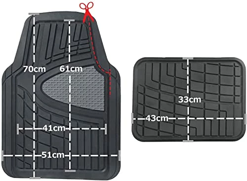 - Measures Front 27. 5″ x 20″ Rear 13″ x 17″ Easily Trim to Fit any Vehicle.The item comes with an extension piece to hold the mats together, this extension needs to be removed/cutted before placing the product in the car.