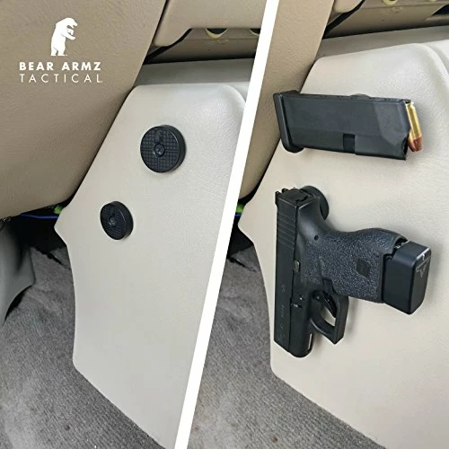 You wouldn’t think much of these magnets and probably would not believe they are even able to hold a handgun. I am in law enforcement and always carrying on and off duty and try and find ways to make it as easy as possible.These things are STRONG. I tested this out a couple days before writing a review and I am highly pleased with the results. You would think you have to line your gun up perfect with the magnet in order for it to hold your firearm, but it is so strong so that is not a problem. From the photo my placement looks as if it is close to the pedal and would get in my way, but there is plenty of room. I drove all weekend with it in the exact spot and never touched it once. Also the magnet has a rubber piece on the outside to protect your firearm from scratches.As for installation, it comes with a screw, you take a screwdriver or power one, screw it into the spot you want it. That simple. The magnet has adhesive on the back that allows you to test different locations before you make it “permanent”.These pack comes with two magnets, you can use one for you gun and mount a clip if you want, or you can mount two guns (can never have too many!). I let me one of my buddies try out the second magnet and he is very pleased. Bear Armz Tactical has new fans in Athens Clarke County Police!
