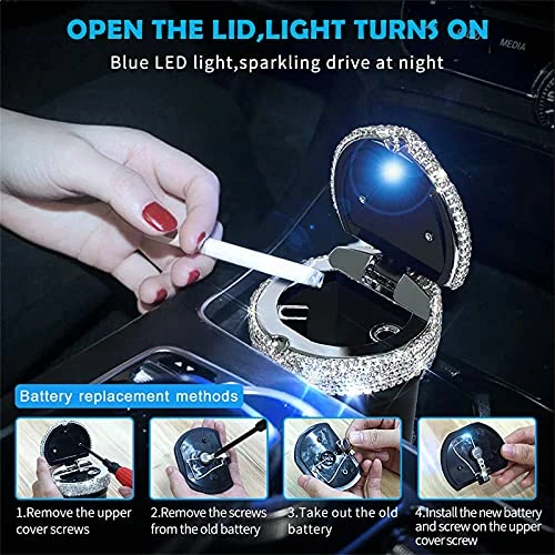 - [COOL BLUE LED LIGHT, CLEAR VISUAL] – The blue LED indicator lights up automatically when you open the lid, giving easy visual access to the interior in dark environments. Extinguishing port and cigarette holder slot are provided.This ashtray comes with two replacement batteries after designed upgrade style,you could replace the battery when it is ran out without any tools requried.