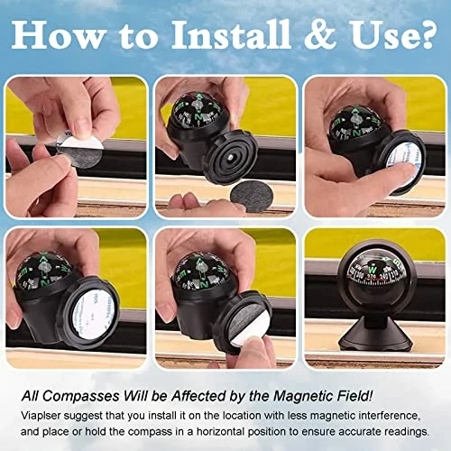 - EASY TO INSTALL & USE — Equipped with an adhesive sticker so it’s easy to stick it on car or boat dashboard. When not in use, keep the compass in a clean, cool place away from the magnetic substance, to avoid the magnetic consumption of the pointer.
