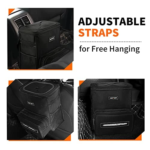 - FREE ADJUSTMENT & PLACEMENT: HOTOR car trash bag with adjustable nylon straps and a quick-release buckle can secure the trash bin where you need it, such as the headrests, passenger seat, and consoles in sedans, SUVs, and trucks. Moreover, the foldable design of the trash bag enables you to fold it into a small piece when not in use. HOTOR car storage organizer always provides meticulous service in the right place.
