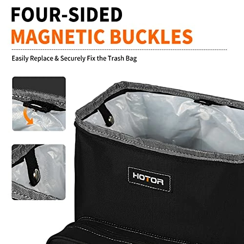 - MAGNETIC BUCKLES: There are 4 premium metallic magnetic buckles inside the HOTOR car trash bag for fastening the extra trash bag. Furthermore, it also simplifies the replacement of the trash bag. Simply unsnap the magnetic buckles to replace the used waste bag with a new one. Then, snap the magnetic buckles to quickly fix the new trash bag. Just 2 steps and it’s all set.