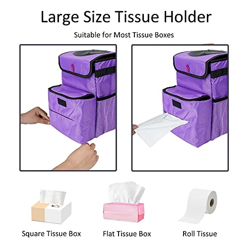 Love this trash thingy. Found 7×6 size tissue boxes fit best in it. I keep hand wipes in one of the side pockets.