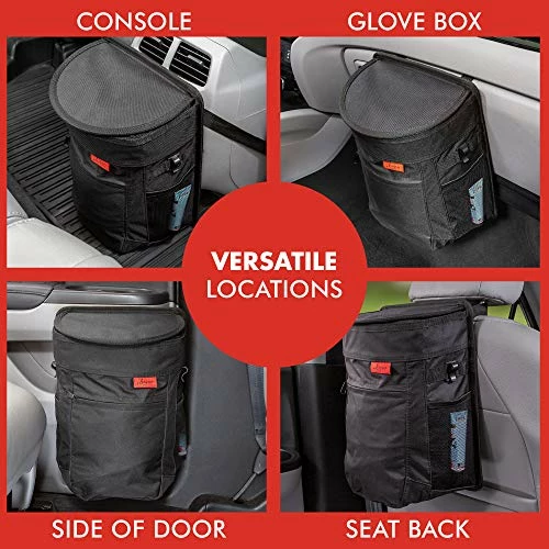 The Lusso Gear Spill-Proof car trash can is an excellent, durable, visually appealing product. I purchased the 2.5 gallons trash can for my 4-door sedan; however, I recommend the 3.5-gallon for SUVs and children. If you are a fast-food person or family, I suggest adding a trash bag as a double liner. The strap is adjustable, easy to assemble, and hangs anywhere in your vehicle. I placed my trash can on the back of the front passenger seat. I did not remove the adhesive strips to secure the can to the back of my car seat. I like the ability to clean the can out or put it in another vehicle.