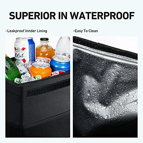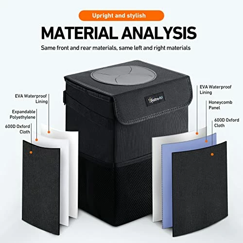 - SUPERIOR STURDY & WATERPROOF: Build-in Honeycomb Panel both front and backside, Expandable Polyethylene on the side with good structure to prevent the trash bin from collapsing easily, so it’s firmer and sturdier than other automotive garbage cans. The car garbage bag is made of 600D Oxford Polyester material and the inside has a waterproof lining that is durable and leak-proof, and it is easy to clean and wipe.