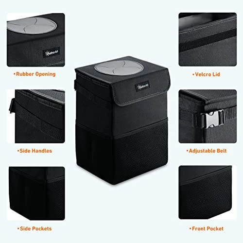 - KEEP THE CAR CLEAN and TIDY: The portable car garbage can has large capacity for trash throwing or car stuff picking easily.The lid with a large leather opening is sealed with Velcro to prevent odors from overflowing and to keep the car clean.