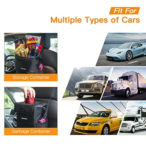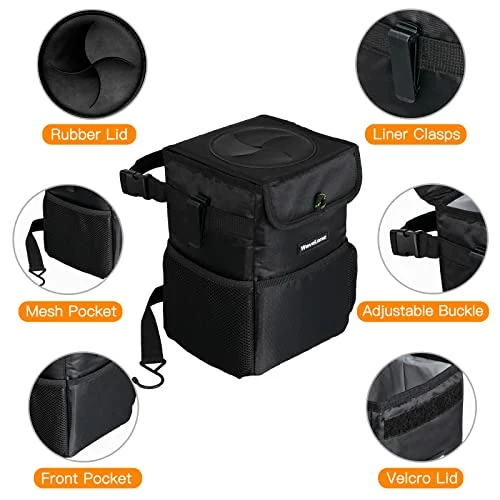 - CAR ACCESSORIES – WAVELANE car trash bag keeps your car clean and organized. With an adjustable strap with a buckle and bottom hook, this car trash can can be mounted on a seat’s headrest, seat back, gear shift, center console, or be placed on the front seat floor or between passenger seats. Made of durable polyester that is easy to clean.