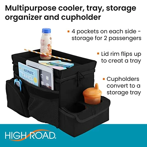 - A Car Seat Organizer and Cooler for the Front or Back Seat – versatile organizer keeps kids entertained in the back and driving and work essentials organized in the front