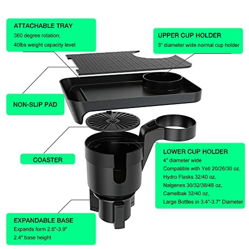 - CAR CUP HOLDER EXPANDER WITH TRAY – The upper cup holder for car is suitable for regular car cup holder with a diameter of 3’’, while the lower cup holder measures 4’’ in diameter, which is for larger bottles, mugs or cups between 3.4″- 3.7″ diameter, so far is Compatible with Yeti 20/26/30 oz, Hydro Flasks 32/40 oz, Nalgenes 30/32/38/48 oz and Camelbak 32/40 oz. This car cup holder in place doesn’t shake, secured holds weight well in the cup holder ensure your drink within comfortable reach.