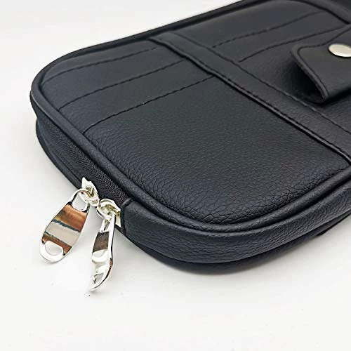 - Multiple Pockets Save Space: This car visor organizer is made with 1 zipped big compartment, 1 mesh deep slip pocket, 5 card holder pockets and 1 Glasses clip. Perfectly for storing your phone, sunglasses, wires, documents, cards, pens, charger cord, earphones, CD and more. it is a great helper as storage bag for your car.