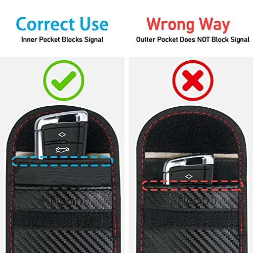 I went shopping a few weeks ago and when I got in my Jeep my brake was locked so my car wouldn’t start. After going through a command on the screen on my dashboard that the car initiated, the brakes unlocked. Asking the dealer they said my car thought it was being stolen so it wouldn’t start. I honestly believe someone tried to intercept my signal while I was within 300 feet of my car. This key fob protector works exactly as stated. The fob fits comfortably in the bag, and when you insert it in the gold pocket the car will not unlock. This holder fits comfortably in a slot in my Crossbody bag. The price is great for the 2-pack. I feel much safer having this fob while I am out. I highly recommended and it’s worth it.