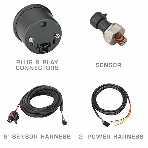 - Includes 1/8-27 NPT Pressure Sensor, 9′ Sensor Harness, 2′ Power Harness, Gauge Visor, Mounting Hardware & Installation Instructions