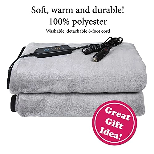 - FLEECE ELECTRIC CAR BLANKET – Keep yourself and your passengers warm in the car with this car heated blanket. The 12 volt electric blanket plugs into your car’s 12V power outlet or cigarette lighter, making it the perfect heated car throw blanket.