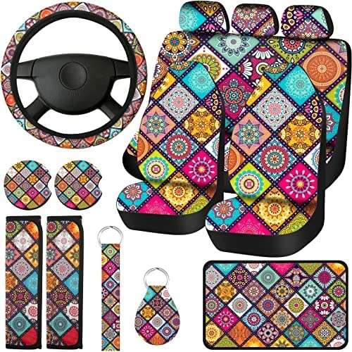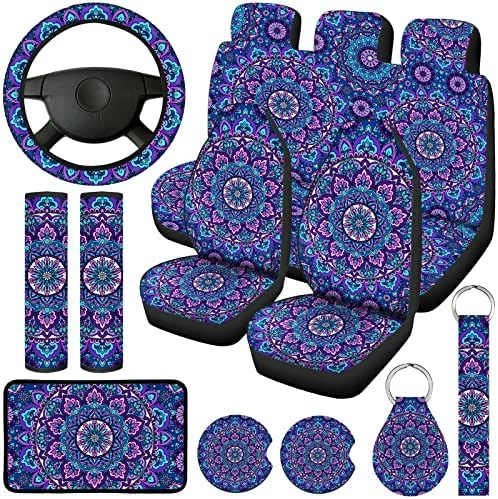 - Package you can get: there are a total of 13 pieces of car accessories in the package, including 1 piece of steering wheel cover, 2 pieces of seat belt pads, 5 pieces of car seat covers, 1 piece of armrest cushion cover, 1 piece of keyring, 1 piece of wrist strap and 2 pieces of car cup holders; The purple mandala lotus car accessories set is stylish, which can meet your demands for car decoration