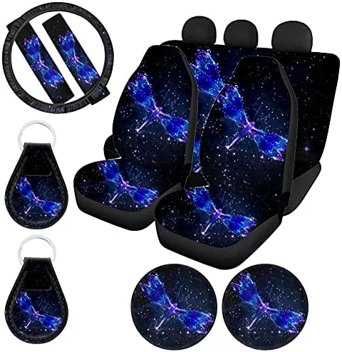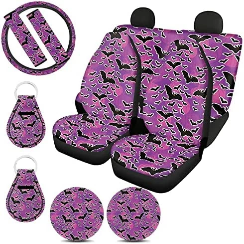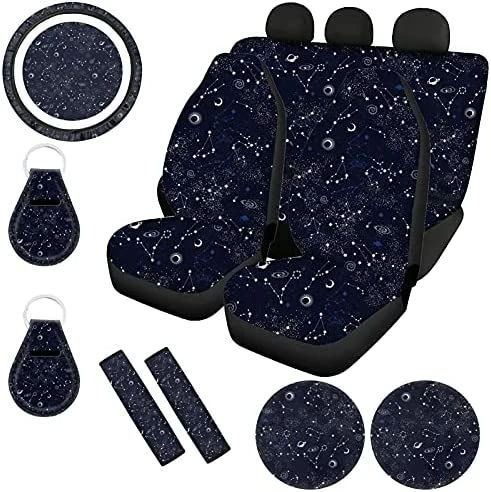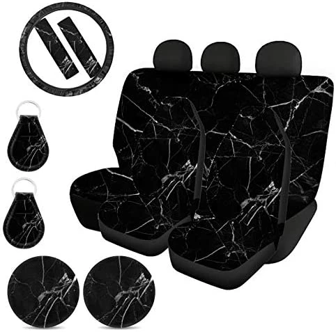 - 【CAR SEAT COVER FULL SET 11 Pieces 】– Package Include 2-pcs car front seat cover + 1-pcs rear bench seat cover + 1-pcs car backrest cover + 2-pcs car seat belt cover + 1-pcs steering wheel cover + 2-pcs car cup holder coasters + 2-pcs key chain covers. 11 pcs universal fit car accessories.