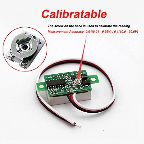 - Measurement Accuracy: 0.01(0.01 – 9.99V) / 0.1(10.0 – 30.0V); And the meter is CALIBRATABLE: The screw on the back is used to Calibrate the meter.