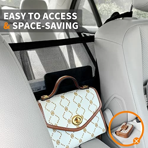 - SUPERIOR MATERIAL: Made of high-quality Oxford cloth, this car interior accessory is durable for long-term use. The mesh material enables you to observe the kids and pets in the rear seat. Moreover, you can just fold the collapsible car handbag holder and store it away when not in use.
