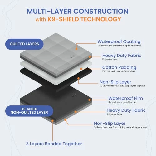 - K9-SHIELD WATERPROOF, NON-SLIP LAYER – Special non-quilted waterproof laminate layer makes the cargo liner completely waterproof while the non-slip backing keeps the cover from moving around (seams and zippers are not watertight). K9-SHIELD is a special textile laminate developed by 4Knines to provide maximum protection for your vehicle.